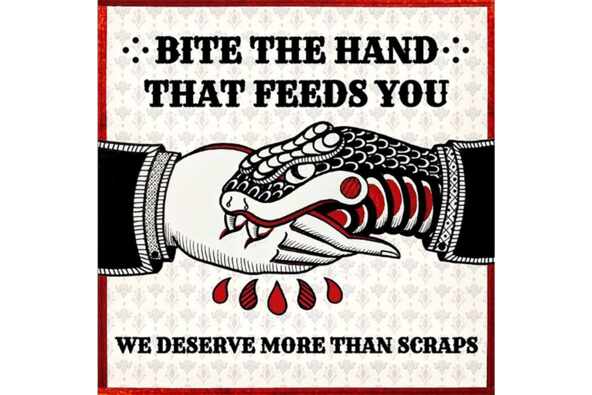 The work of artist, cultural worker, organizer, and sexual and reproductive health justice advocate payal kumar merges the traditional folk art of kumar’s parents’ villages in Bihar with the style of American traditional tattoos. The print Bite the Hand That Feeds You, (2021) one of their three works displayed, depicts a large snake biting a pale and shaded hand, whose drops of stark red blood draws the viewer in, then delivers its message in a bold and serifed font, similar to revolutionary block print: “Bite the Hand That Feeds You/ We Deserve More Than Scraps.” kumar was inspired by the wisdom of communities on the margins who have survived the apocalypses of racism and colonialism. “I was really thinking about how we could unearth and excavate a lot of our ancestral memories of collective care and survival and power,” they shared, “and put them into practice and alchemize mutual aid.”
