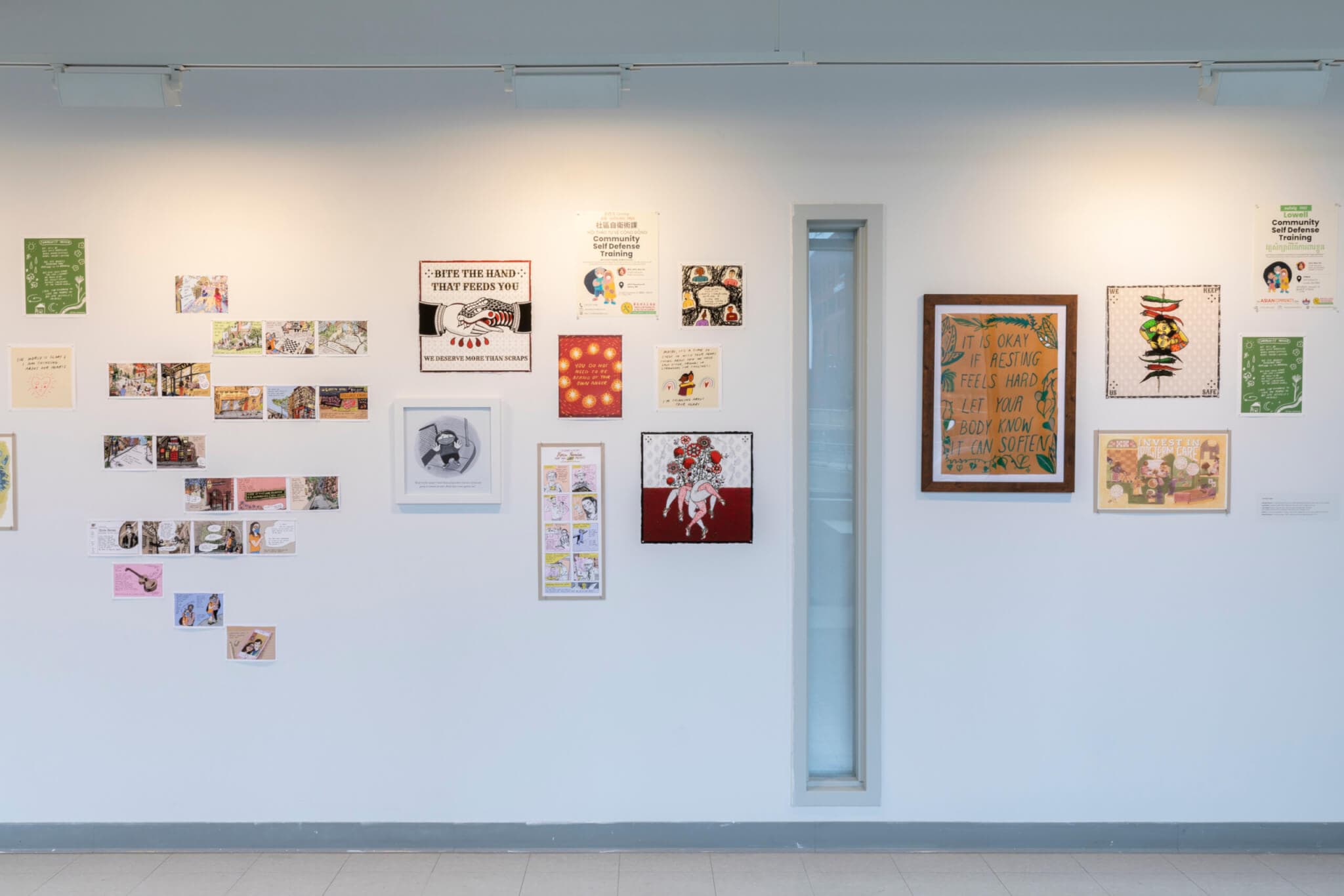 “Call and Response: Illustration in Uncertain Times” is a collection of print media made up of the illustrations and graphic designs of seven local artists, many of whom are community activists. On exhibit at the Pao Arts Center, the posters and cartoons, as well as one woven object—a sweater—are displayed on a single gallery wall. Pieces communicate COVID-19 information, document hate crimes and racism against the AAPI community, make a plea for softness, and require the viewer to imagine radical community care.