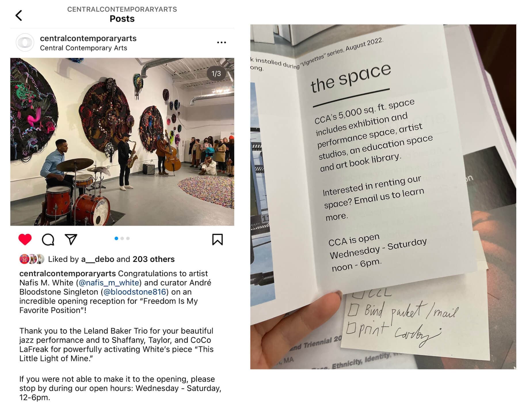 White’s call for support resulted in about forty community volunteers offering to keep the doors open from 12–6 PM daily for the remainder of her exhibition. The request also led to various community members putting pressure on CCA to take accountability and apologize. On Sunday, March 12, CCA posted a public statement from their Instagram addressing White’s claims, opening with: “Over the past two weeks, there have been false statements and accusations made about CCA and the director, including allegations by an artist that she was not paid for her work and was staffing her own gallery hours.” The statement proceeds to share that CCA is “a W.A.G.E. certified organization” that pays “all artists generous artist fees and material stipends.” CCA posits, “Our hours have not differed from those hours listed on our website,” but also admits that, “for the past two weeks, we have had fewer open hours due to lower exhibition attendance on weekdays.” The statement implies that the change in hours occurred two weeks prior (which would have been late February or early March) and was a consequence of low visitor numbers. The statement ends with a reiteration of CCA’s mission, and some well-wishes for White: “CCA is dedicated to building artistic innovation, local power, and public access. We look forward to continuing to work with our community to fulfill this mission. We are so grateful for all that Nafis M. White has contributed to the space and wish her the best.”