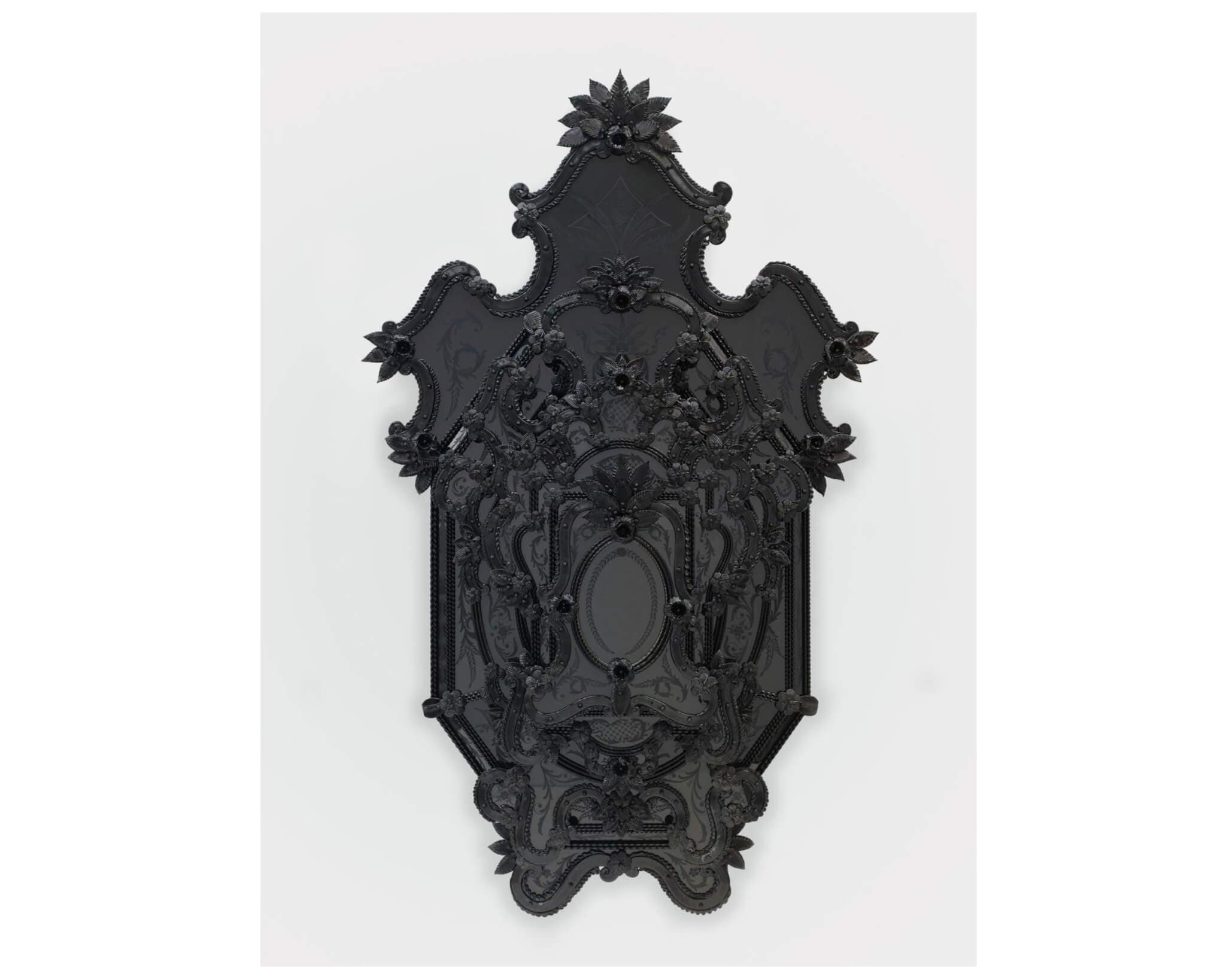 Two smaller, elaborately layered black mirrors—Iago’s Mirror (2009) and Mark (2009)—punctuate the first section of the show, demonstrating the glassmaking method Wilson has perfected. Prior to representing the United States in Venice, Wilson began studying glassblowing on the nearby Italian island of Murano—a place well known for its centuries-old glass craftsmanship—and conducting research on the African population in Venice as early as the fifteenth century. To create these dark mirrors, Wilson paints the back side of Murano glass panes black and then positions them variedly layered atop and gridded alongside one another. The reflection fractures across the multiplicity of the mirrors. Their blackness absorbs the light to create a darkened, beclouded image.