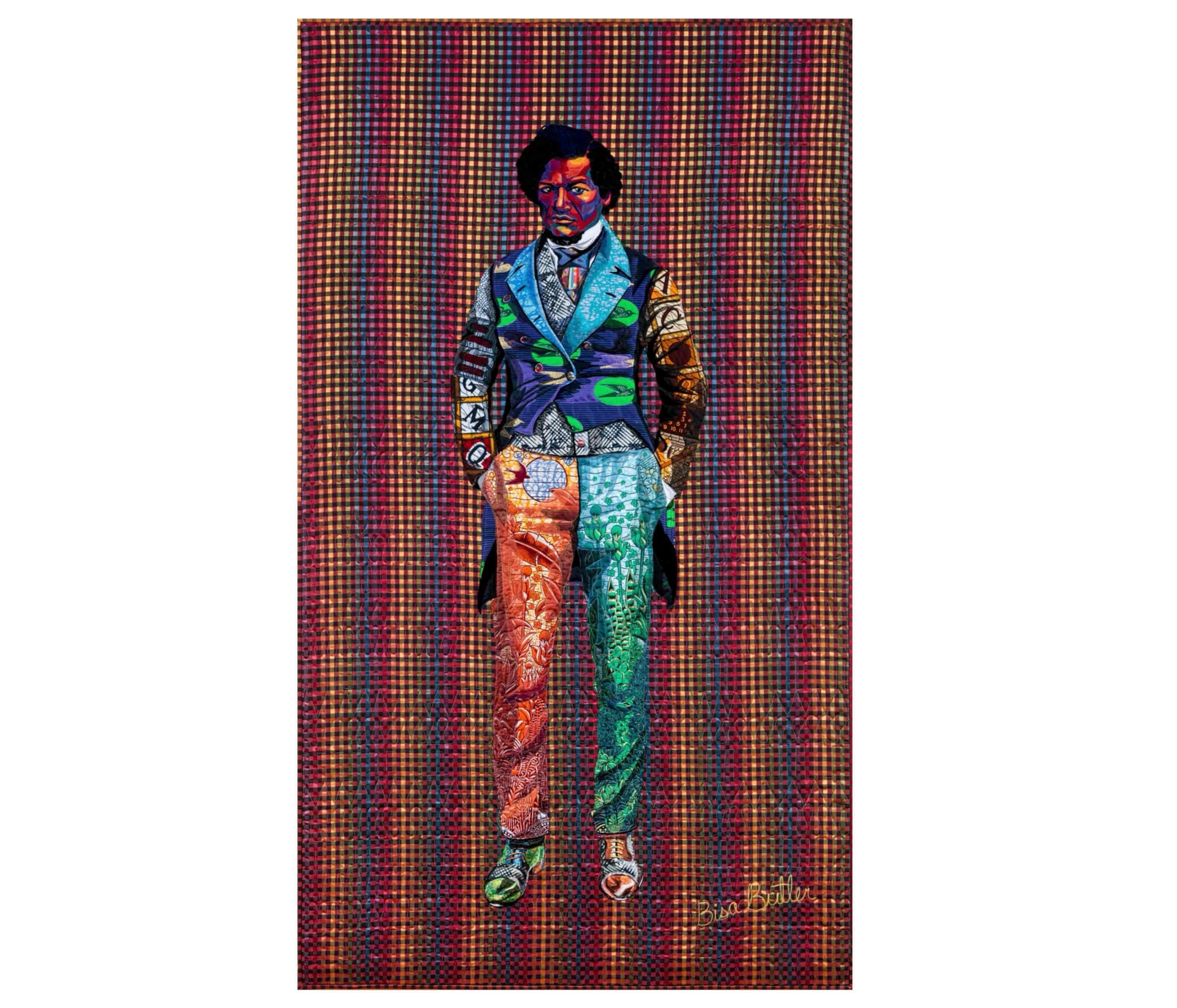Bisa Butler, The Storm, the Whirlwind and the Earthquake, 2020. Reproduction of cotton, silk, wool, and velvet quilted and appliqued. 88 x 50 inches. Courtesy of the Ethelbert Cooper Gallery at Harvard University’s Hutchins Center for African and African American Research.