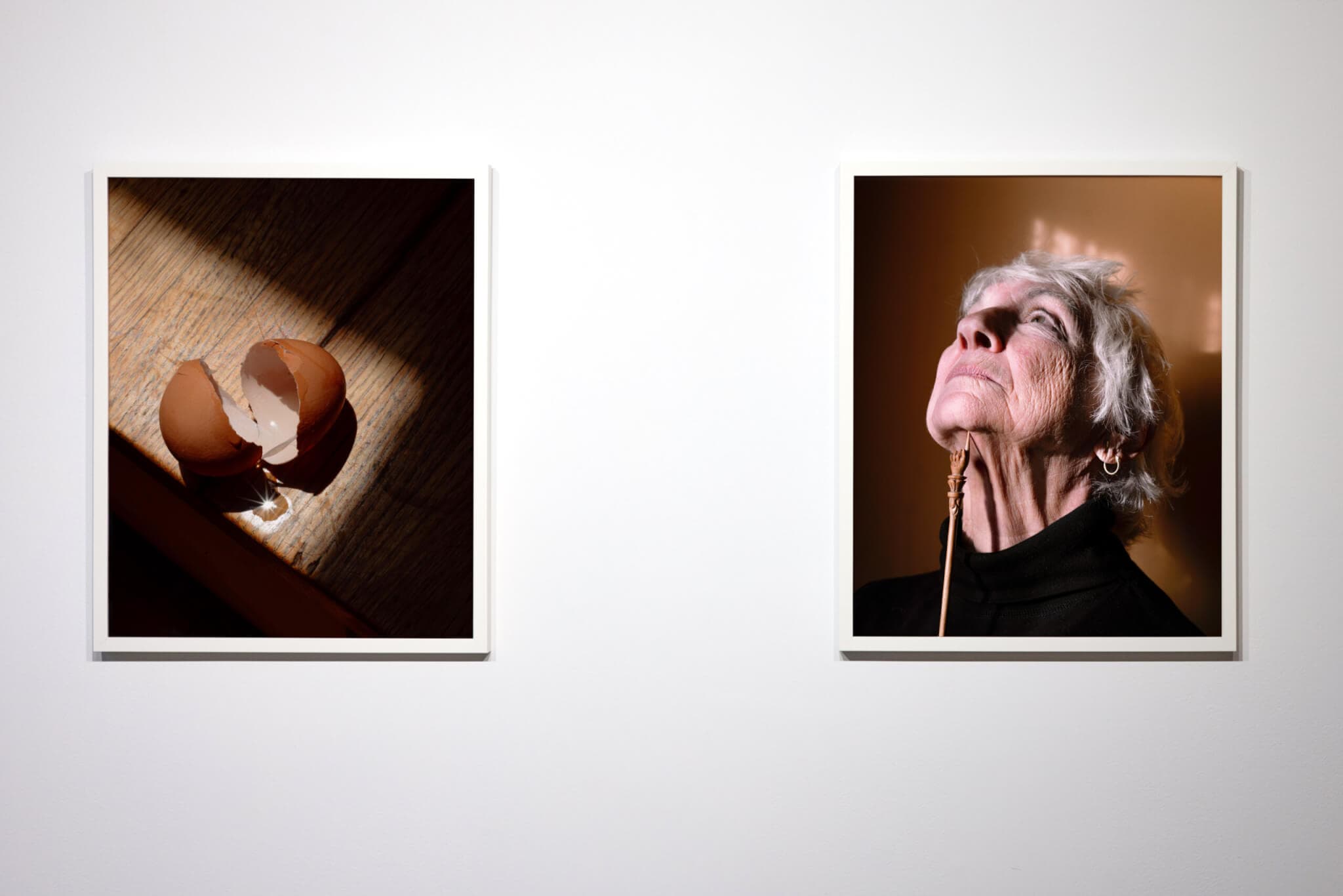 The first pairing of photographs is an image of a cracked egg, Giving (2024), and the portrait Yad (You) (2023). Their palettes and the light coming from the left of the composition, the same direction as the light from the gallery’s nearby window, formally connects them. There is tension in the subjects of both photographs. One shows a broken form, the egg, that is ripe with metaphors of birth, femininity, pregnancy, and, because it is fractured, death. The other is a portrait of an elder woman looking calmly upward, with dappled window light behind her. A wooden instrument held by an unseen hand ends in a small, curved fist, its pointer finger extended straight to prick the underside of the woman’s chin. There is the potential of extreme pain being exhibited, but it is at the cusp, not the apex—the fragility and thinness of her skin is evident as the light rakes across it, textures showcasing all the aspects of time that appear on skin as the result of a lived life. Yet this tension is manageable, not frightening, as after all it is just a small rod of wood. This “hand” is a yad, a Jewish ritual pointer, or stylus, used to follow the text while reading the Torah—a tool that allows the Torah to unfold for the reader while simultaneously protecting the parchment from the oils of their skin. It seems almost an act of rebellion to put the very thing that is made to protect a sacred object from our human flaws to the skin, that which poses danger to the sacred.