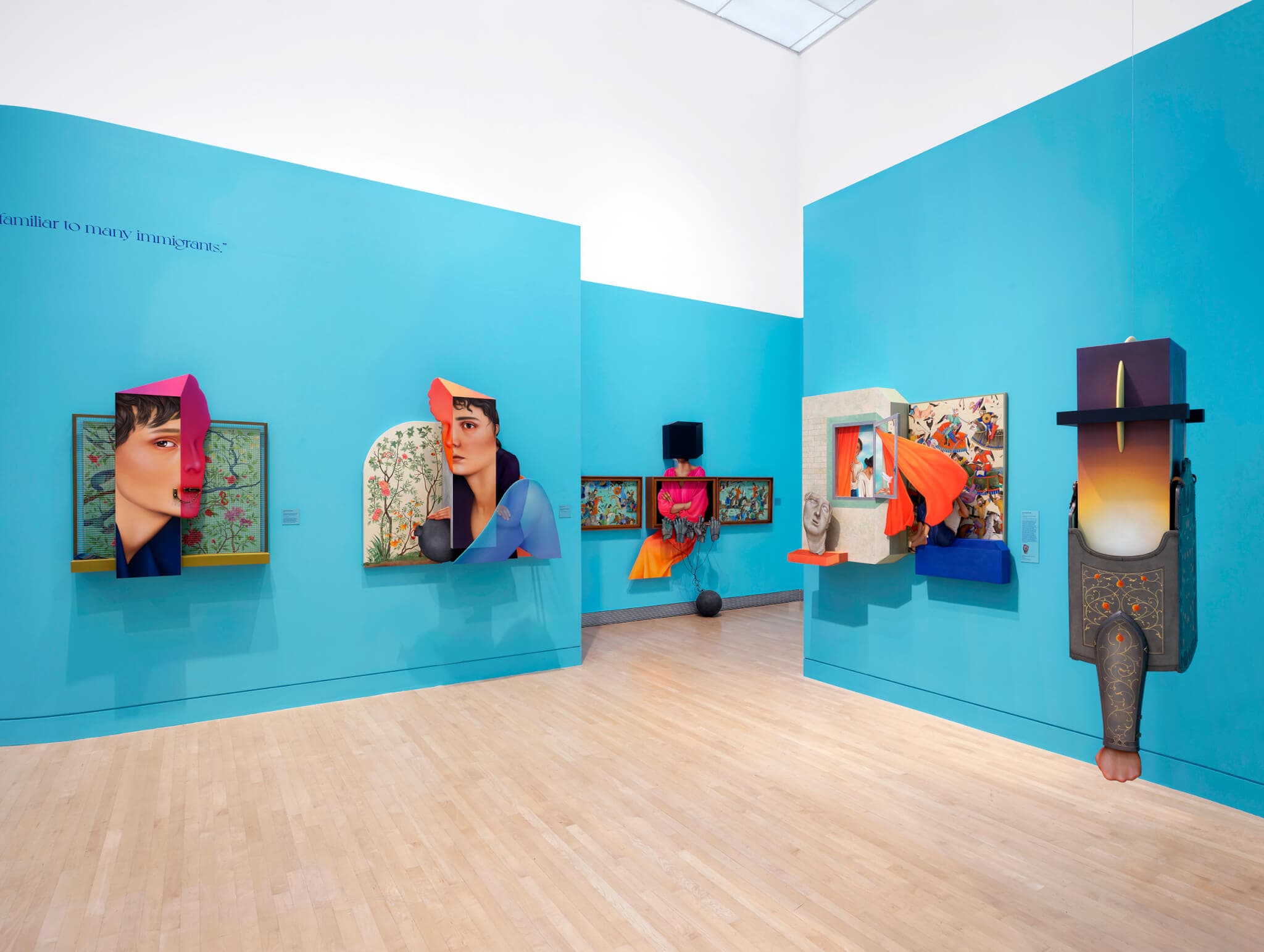 Now on view at the Rose Museum at Brandeis University, Khosravi’s first comprehensive museum survey, “Black Rain,” charts this progression, showcasing work from her time as a postbaccalaureate student at Brandeis until today. Enclosed by walls painted the Hockney-esque blues and greens found in Khosravi’s longed-for earthly utopias, the Rose Museum’s Henry and Lois Foster Director and Chief Curator Dr. Gannit Ankori has created a space that operates much like the interior worlds Khosravi’s protagonists retreat to, allowing the audience to participate in a silent but powerful resistance to the patriarchal violence that continues to oppress women in Iran specifically, and across the globe more broadly. Punctuated by Persian miniature illustrations loaned from the Harvard Art Museums and Museum of Fine Arts, Boston—a tradition that inspires Khosravi’s practice— “Black Rain” is a thrilling dive into the mind of an artist who believes that stories—the ones we tell ourselves, the ones we have access to, the ones that are told about us—have the power to grant us freedom.