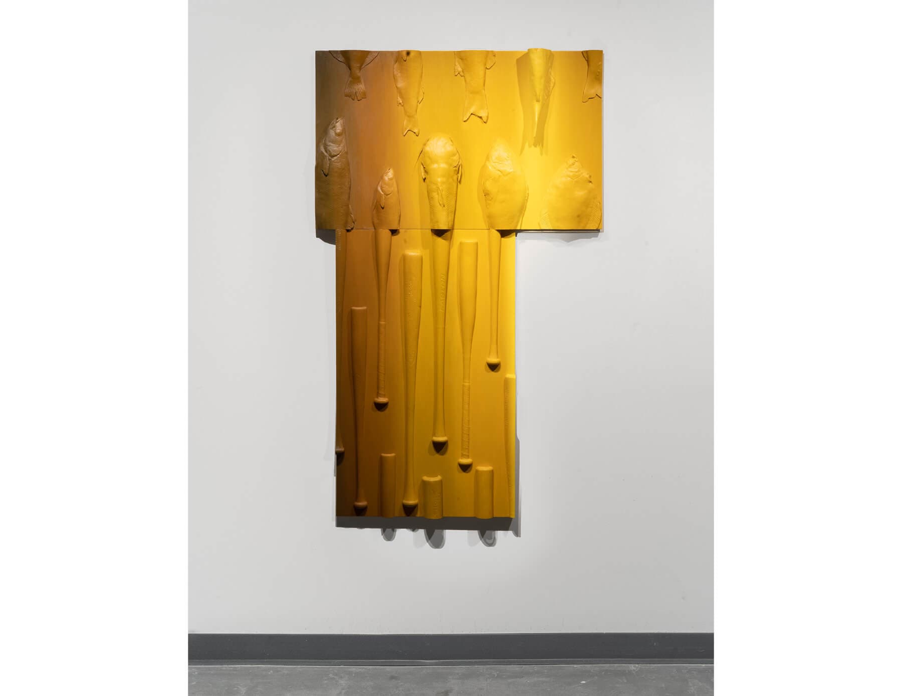 Kim’s sculptural paintings are kind of like looking at a lover’s skin too, in the sense that looking at braids, fish bones, fish, and bats will certainly elicit any number of personal associations, memories, and feelings for viewers. These playful combines from Kim’s Homomorphy series fuse together panels coated with cast forms with similar appearances but arbitrary relationships. The sculptural paintings readily establish the ways in which context, proximity, and placement dictate visual experience: fishbones and braids look and feel different next to each other than either archetype would look alone. The sculptural paintings also bring the fuzziness of culturally enforced binaries to the forefront, such as nature versus artifice, organic versus inorganic, and living versus nonliving. If fish and baseball bats are different, wherein do those differences lie?  Textural and evocative upheavals of the taxonomic, the Homomorphy works again ask for an embodied, material understanding of vision.