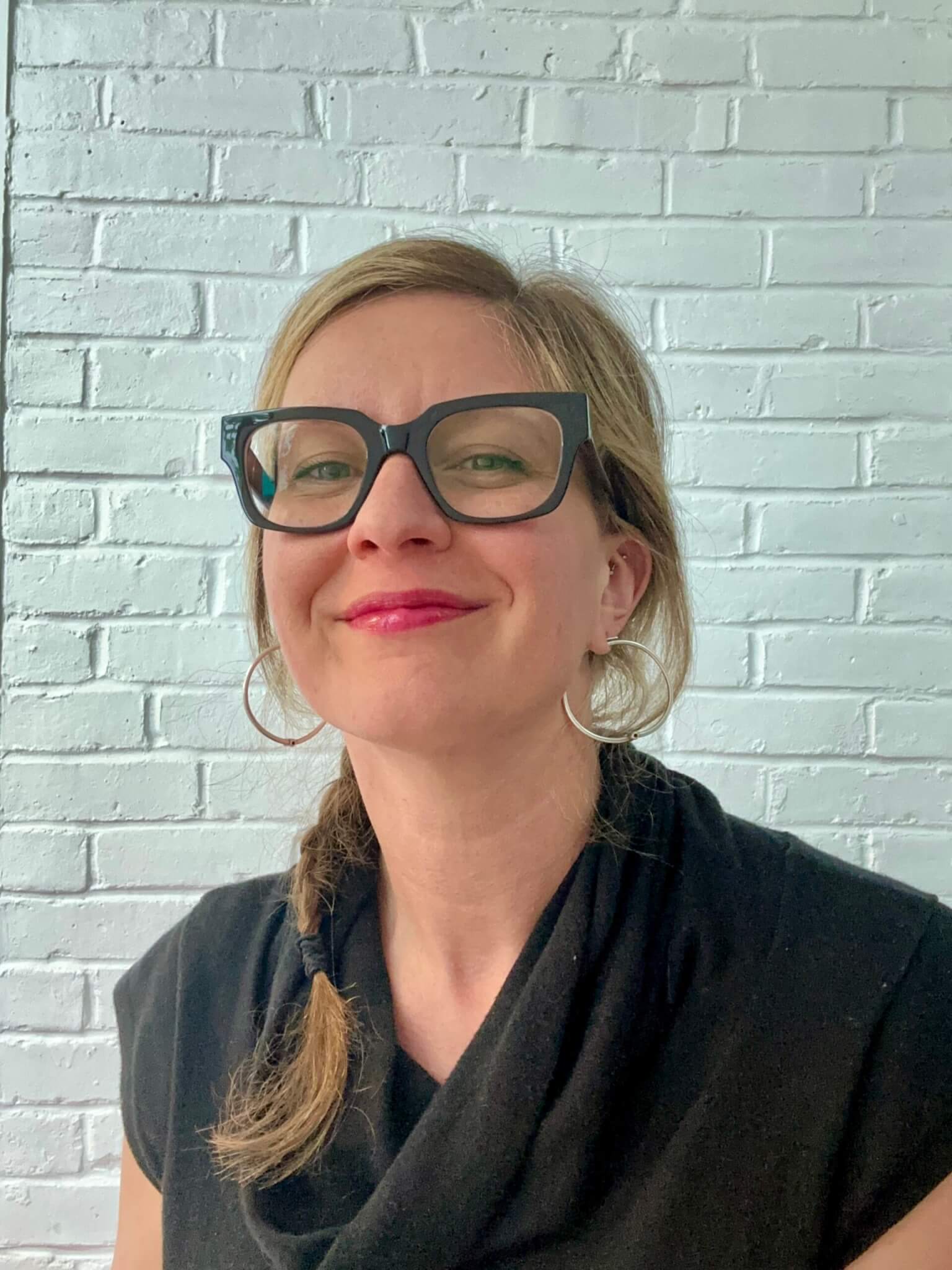 A black and white drawing of Jacqueline Houton smiling at the viewer in a three-quarter profile towards the right. She's wearing eyeglasses, and has bangs with long hair.
