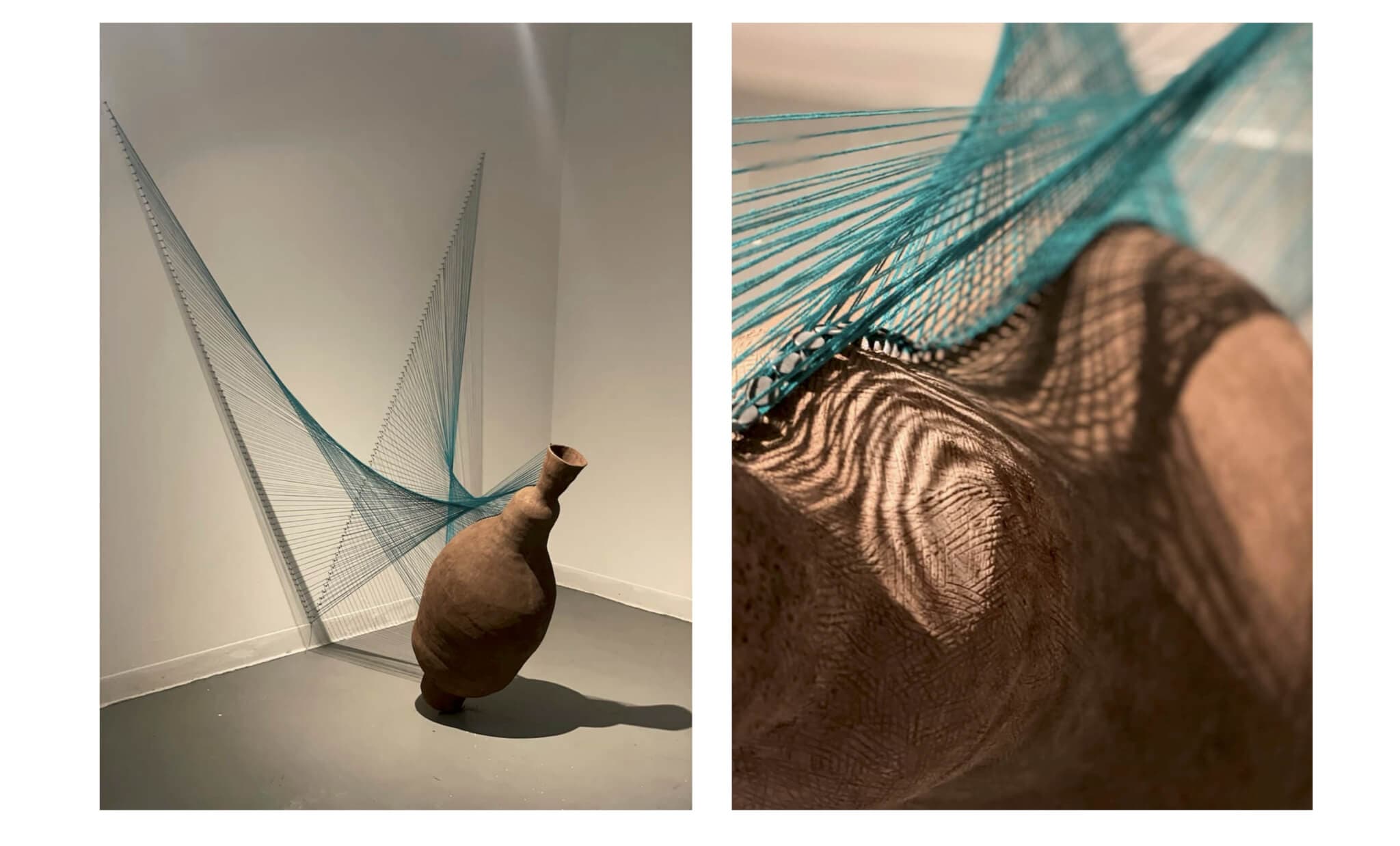 Anis Beigzadeh, Let It Go, installation view (left) and detail (right), 2023. Ceramic and fiber. 6 x 5 x 4 ft. Featured in the “Best of SouthCoast” exhibition juried by Carmen Hermo on view at the New Bedford Art Museum June 12–August 31, 2025.