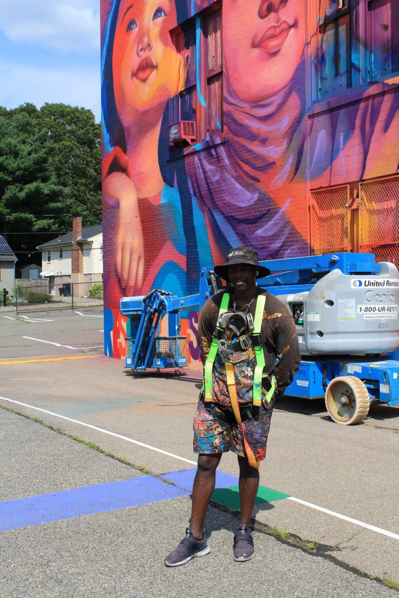 Artist Thomas “Detour” Evans in front of his work Together, We Rise, a mural commissioned by the Boston Mayor’s Office of Arts and Culture (MOAC) in West Roxbury. Photo by Elisa Rowe for Boston Art Review.