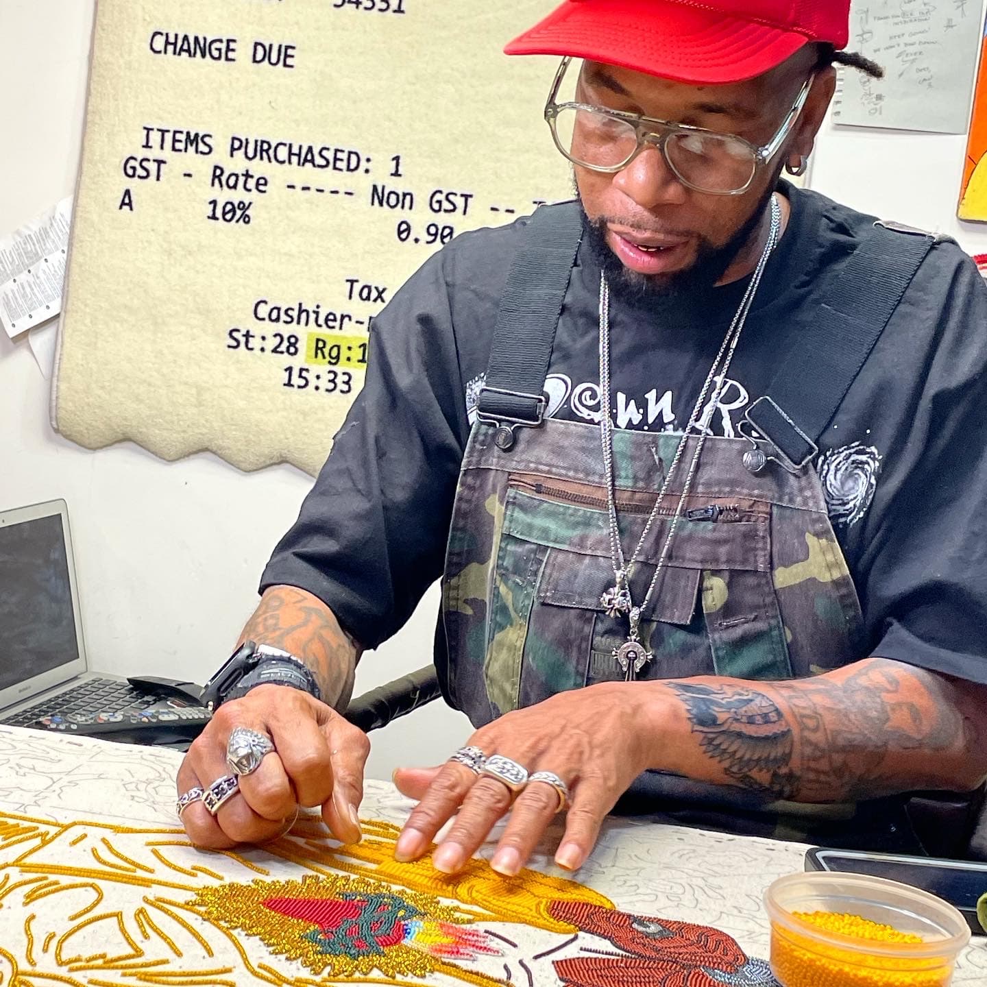 Looking at Melancon’s mesmerizing, painstakingly crafted beadwork—and thinking of Leigh’s Sentinel—we were reminded of Stephen Hamilton and his weaving-based work to uplift African narratives by inserting them into Boston Public School’s (BPS) curriculum. Hamilton came through N+T’s Public Art Accelerator in 2018, and his project’s unveiling in the Bolling Building (with spoken words, dance, and drumming) still inspires us as we work with artists local and otherwise. Hamilton and his peers need an active support system of galleries, collectors, and funders to continue and evolve their work.
