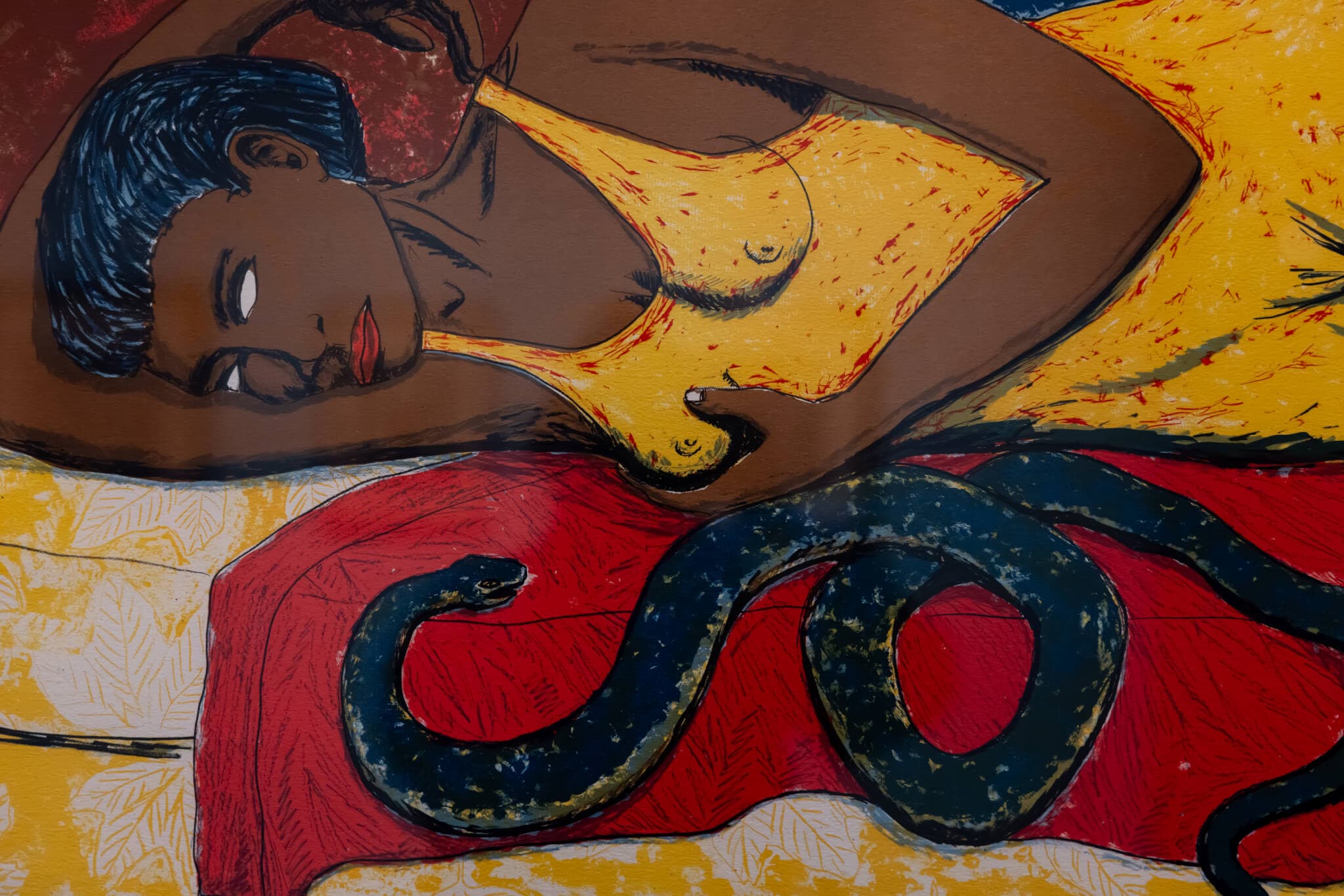 Alison Saar, Black Snake Blues, 1994. Color lithograph. Harmon and Harriet Kelley Collection of African American Art. Photo by Melissa Blackall. Courtesy of the Alain Locke Gallery.