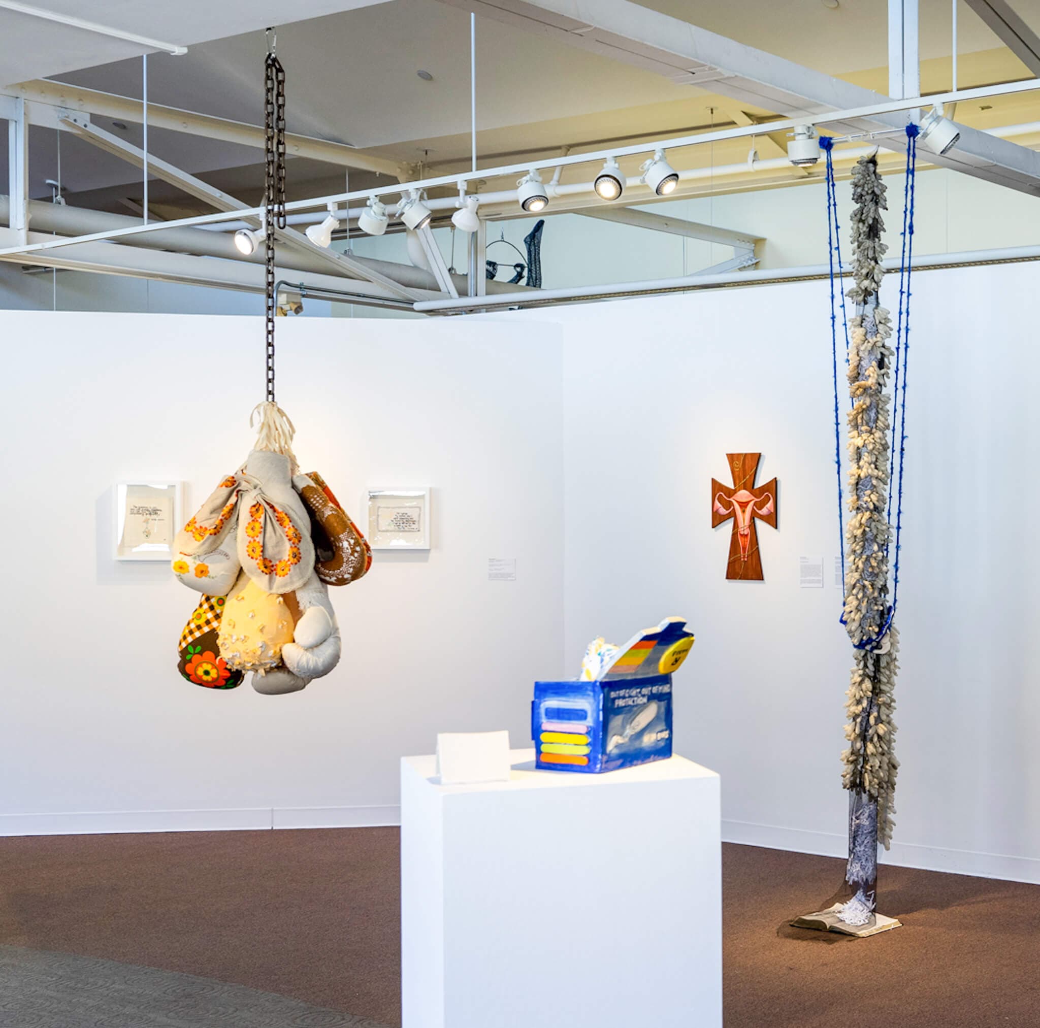Installation view, “Deeply Rooted: Faith in Reproductive Justice,” Kniznick Gallery, Hadassah-Brandeis Institute. Curated by Caron Tabb. Left to right: Diana Weymar (Tiny Pricks Project), Zoë Buckman, Susan Chen, Cora Ramirez-V, Dell M. Hamilton. Photo by: Elizabeth Ellenwood.