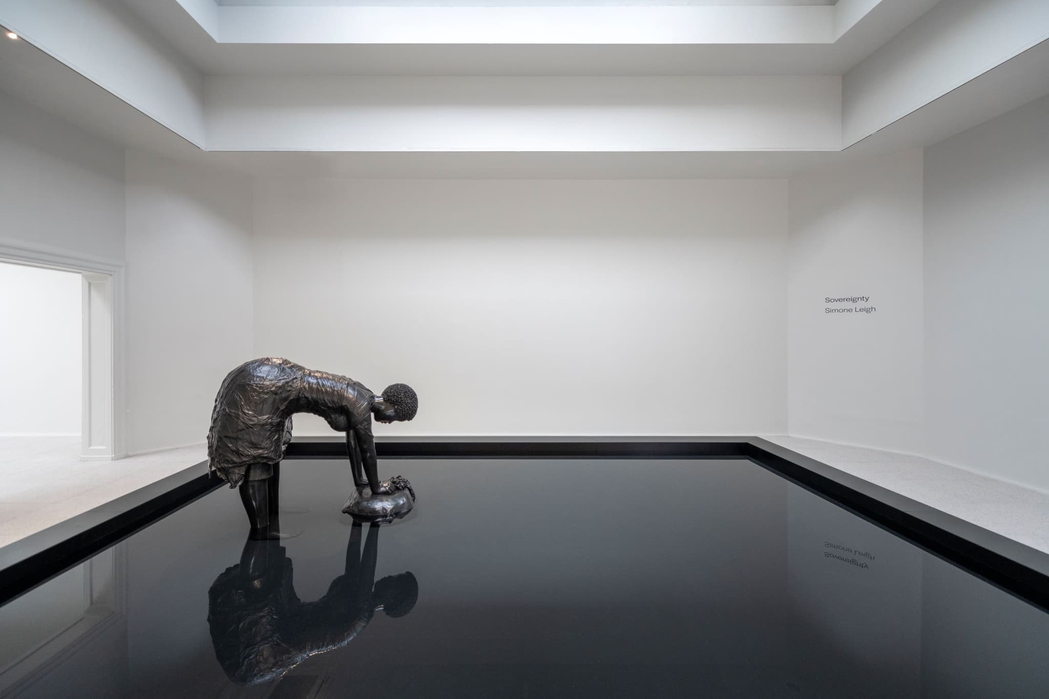 Façade and Loophole feel like the most novel contributions to the oeuvre of the New York-based artist whose work quickly catapulted to stardom in the United States. Once inside the pavilion, viewers are met by Leigh’s familiar forms rendered in dark bronze and glowing ceramic white. Though masterfully created and aesthetically beautiful, there’s almost something about the sculptures that feel too polished or removed from the contexts Leigh pulled them out of. In the first gallery, a long reflection pool features a sculpture of a woman bent over a rock. Frozen in time, Last Garment references an 1879 photograph taken in Jamaica by C. H. Graves titled Mammy’s Last Garment, which captured a laundress hard at work. It’s the type of image that was sent on postcards to promote white tourism in the British-occupied Caribbean colonies. Though rendered with care at the hands of Leigh, it’s not immediately clear how this sculpture is meant to imbue the sovereignty that the woman depicted in the photograph was not permitted to possess.