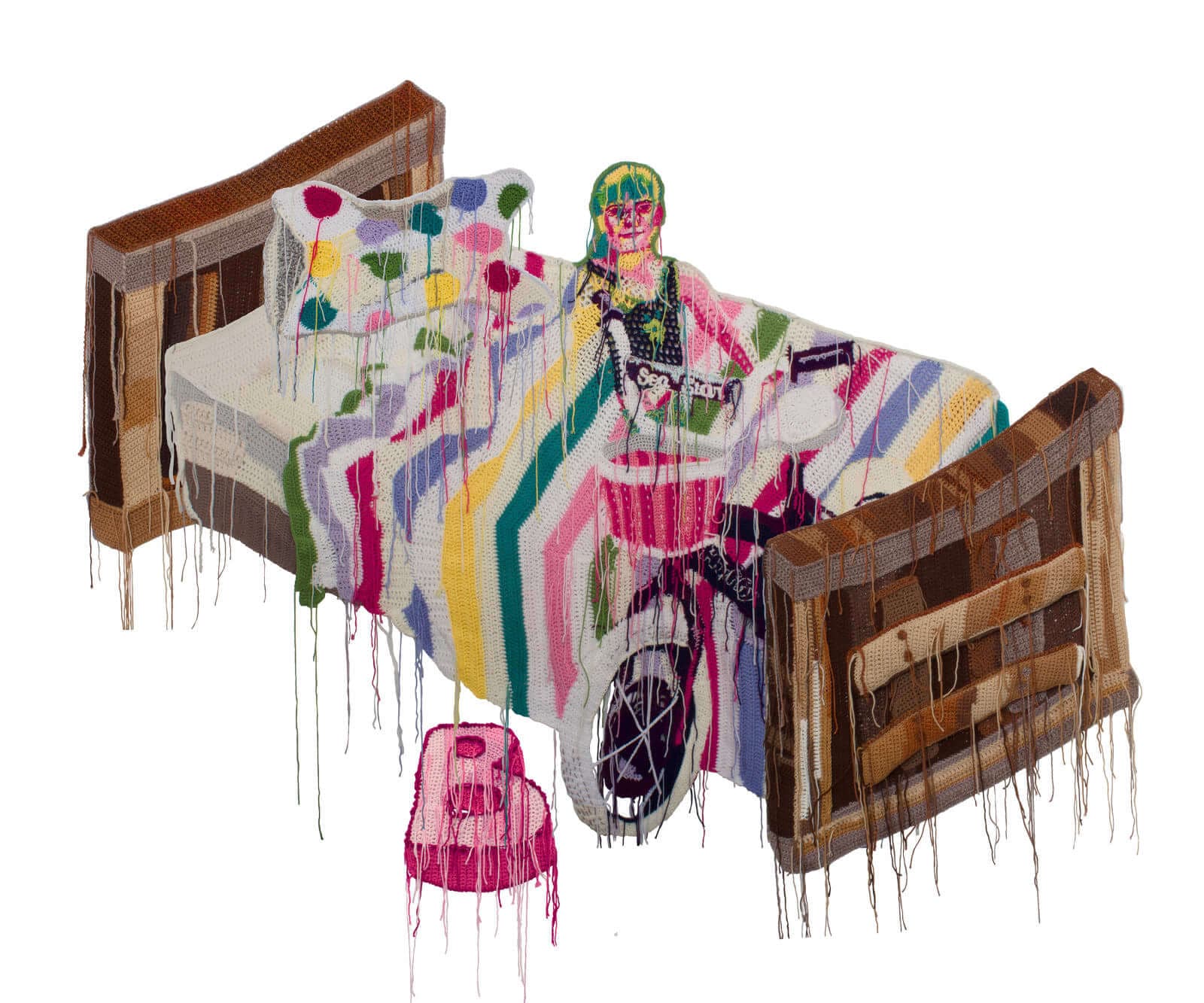Baylee Schmitt, Striped Bed (head/footboard), 2024. Crochet with yarn, wire. 6 x 8 feet. Courtesy of LaiSun Keane.