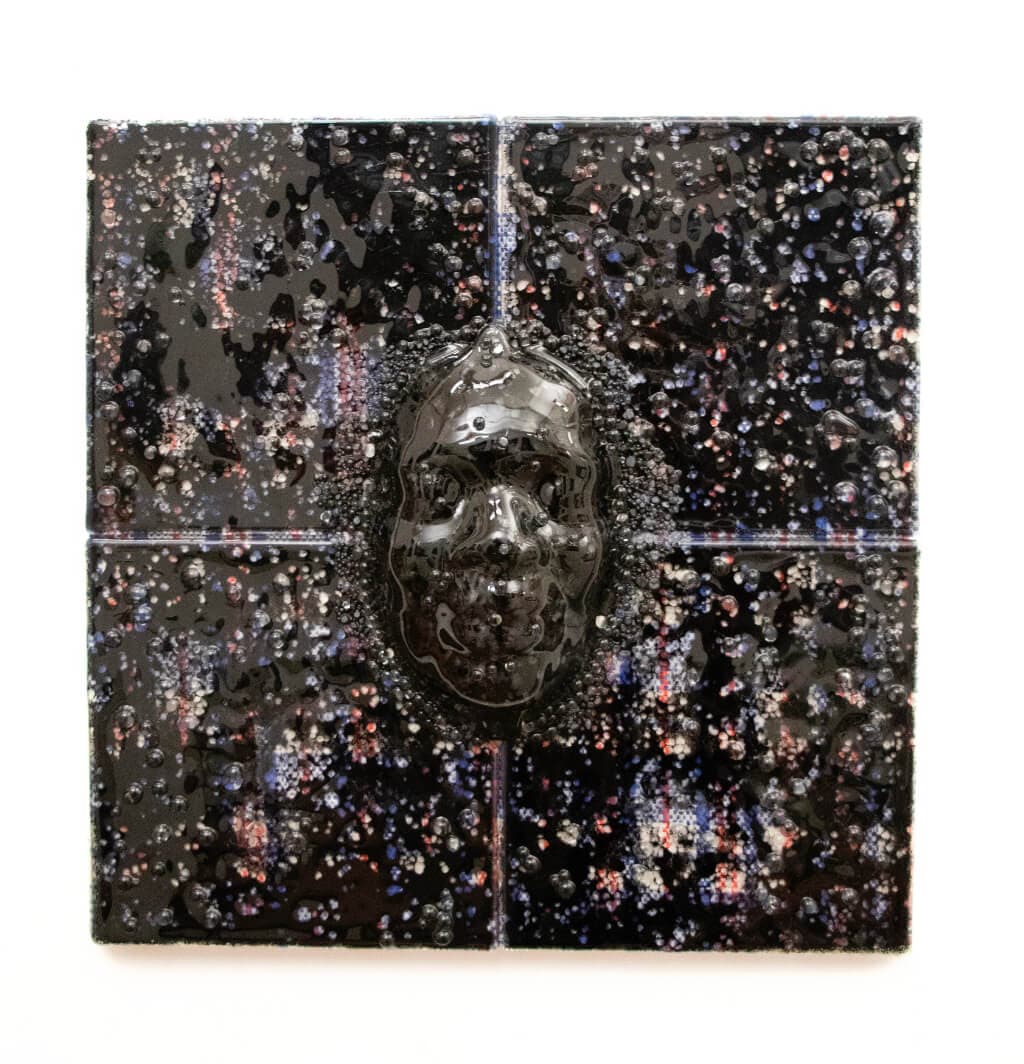 Layo Bright, Point of Last Scatter, 2020. Kiln formed glass, Ghana Must Go bag on wood frame, 20″ x 20″ x 3″. Photo by Layo Bright. Courtesy of Tariku Shiferaw.
