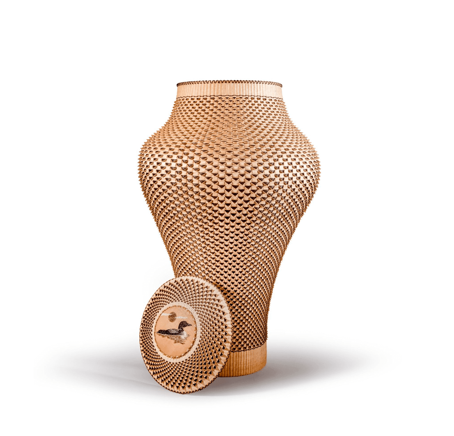 Jeremy Frey, Loon, 2020. Ash, cedar bark, porcupine quill on birch bark, and dye, 36″ x 23″ x 23″. Private collection of Catherine Stiefel, California. © Jeremy Frey. Photo by Eric Stoner.