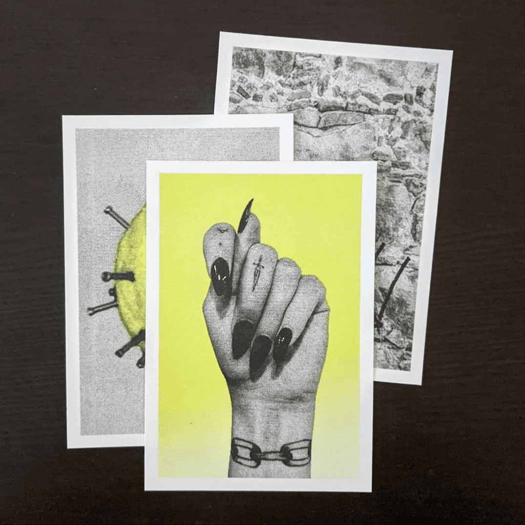 Protection Set with evil eye, mano fico, and lemon hex talisman set of 3 risograph, light lime and black ink on white paper. 4.5 in x 6.5 in. Image courtesy Snake Hair Press.