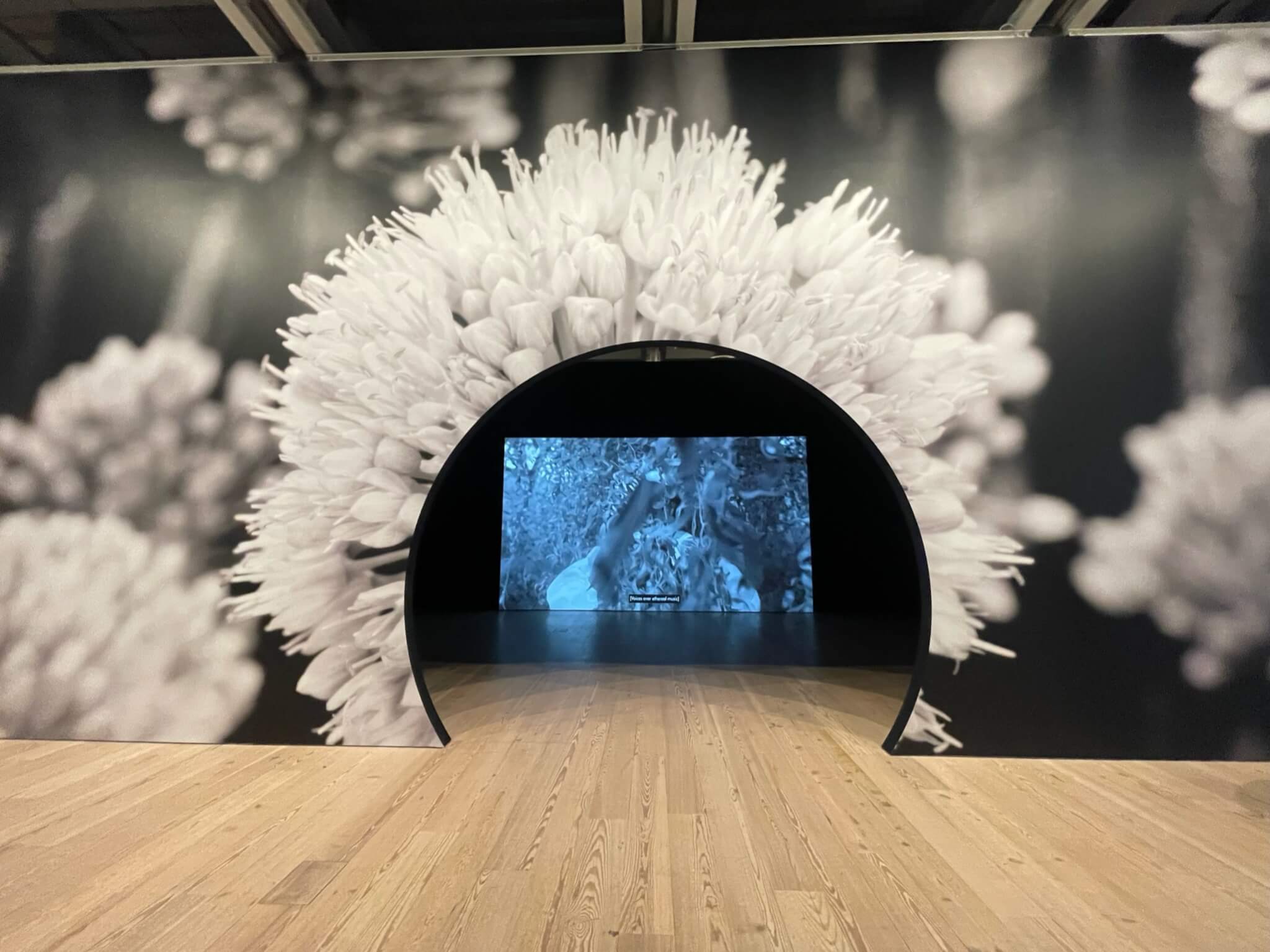 If the sixth floor is a quiet series of questions, then the fifth floor is certainly louder, yet still questioning. From the vantage point of the elevators, visitors are greeted with Roxbury-born Tourmaline’s Pollinator, a seamless video loop ensconced in a cutout of the wall which evokes the floral; to enter the area would be to walk into the pistil.