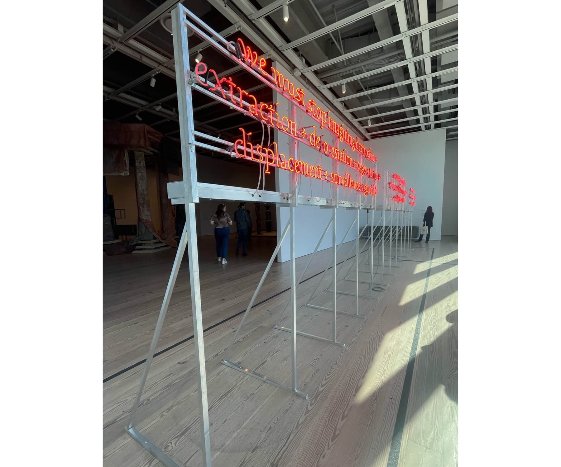 But even when the work does literally spell out a political commentary on our present moment, it’s done so with subtlety. Demian DinéYazhi’’s installation of neon text we must stop imagining apocalypse / genocide + we must imagine liberation, flickers letters that spell out “free palestine”—a choice the curators weren’t aware of prior to installation. Indeed Demian DinéYazhi’’s installation has garnered attention, but the covertness with which the artist had to make that statement says something about a show that generally sought to play it safe.