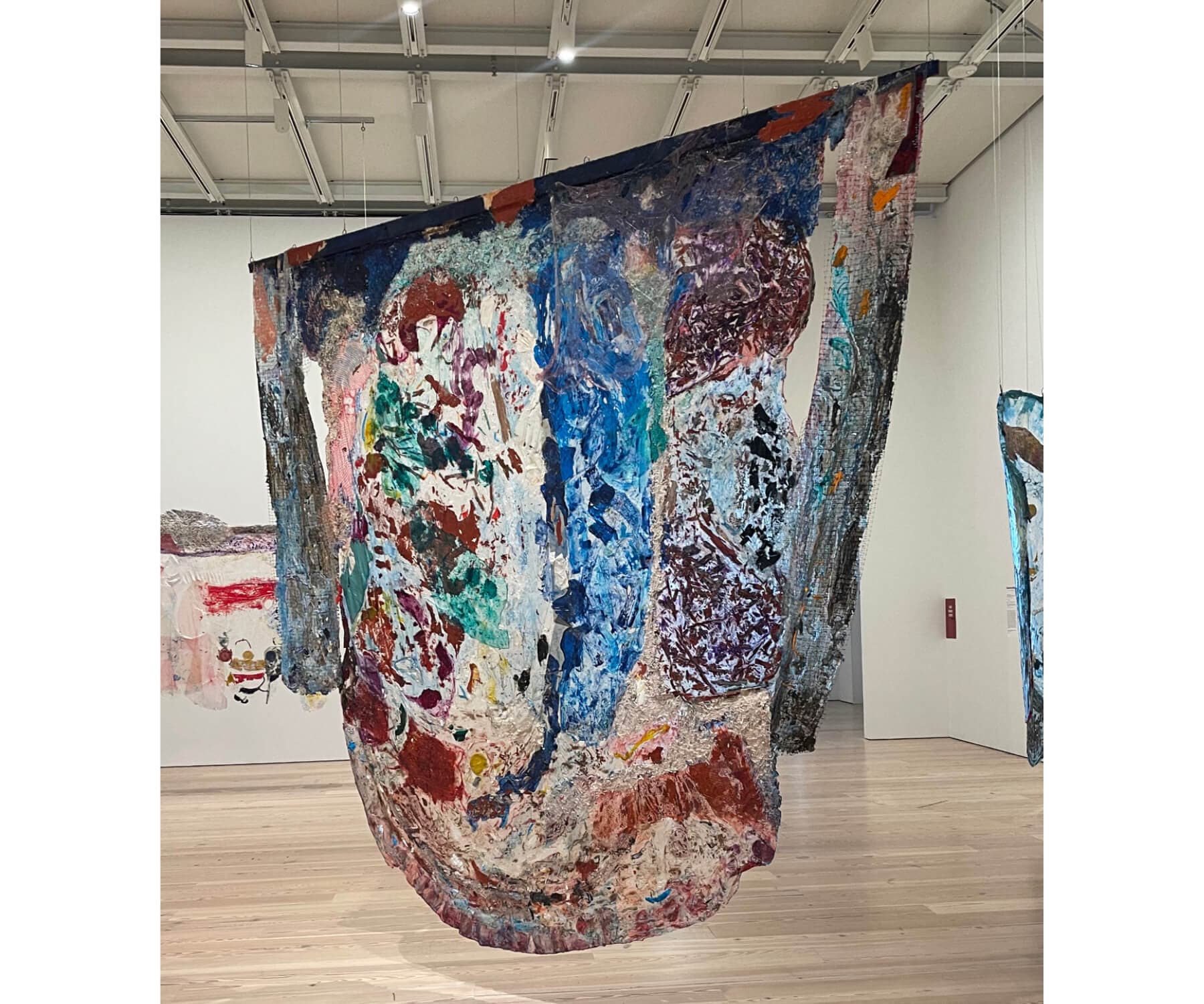 There is no section that better exemplifies that the act of listening is crucial than Suzanne Jackson’s limber paintings, which require no substrate. Whether hanging from the wall or suspended, these skins of pigment, found objects, and gel medium sing brilliantly in a way that says, “How did it take me so long to see this?”