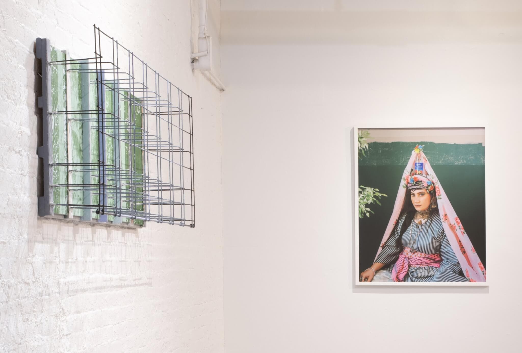 (left) Samnang Reibe, Baitong Pe Khnohng (Green from Within), 2024. (right) Feda Eid, Making Rose Water Out of Roses II, 2023. Installation view, “Willful Dialects,” The Distillery Gallery and No Call No Show, 2025. Photo by Yi Cynthia Chen. Courtesy of the Distillery Gallery and No Call No Show.