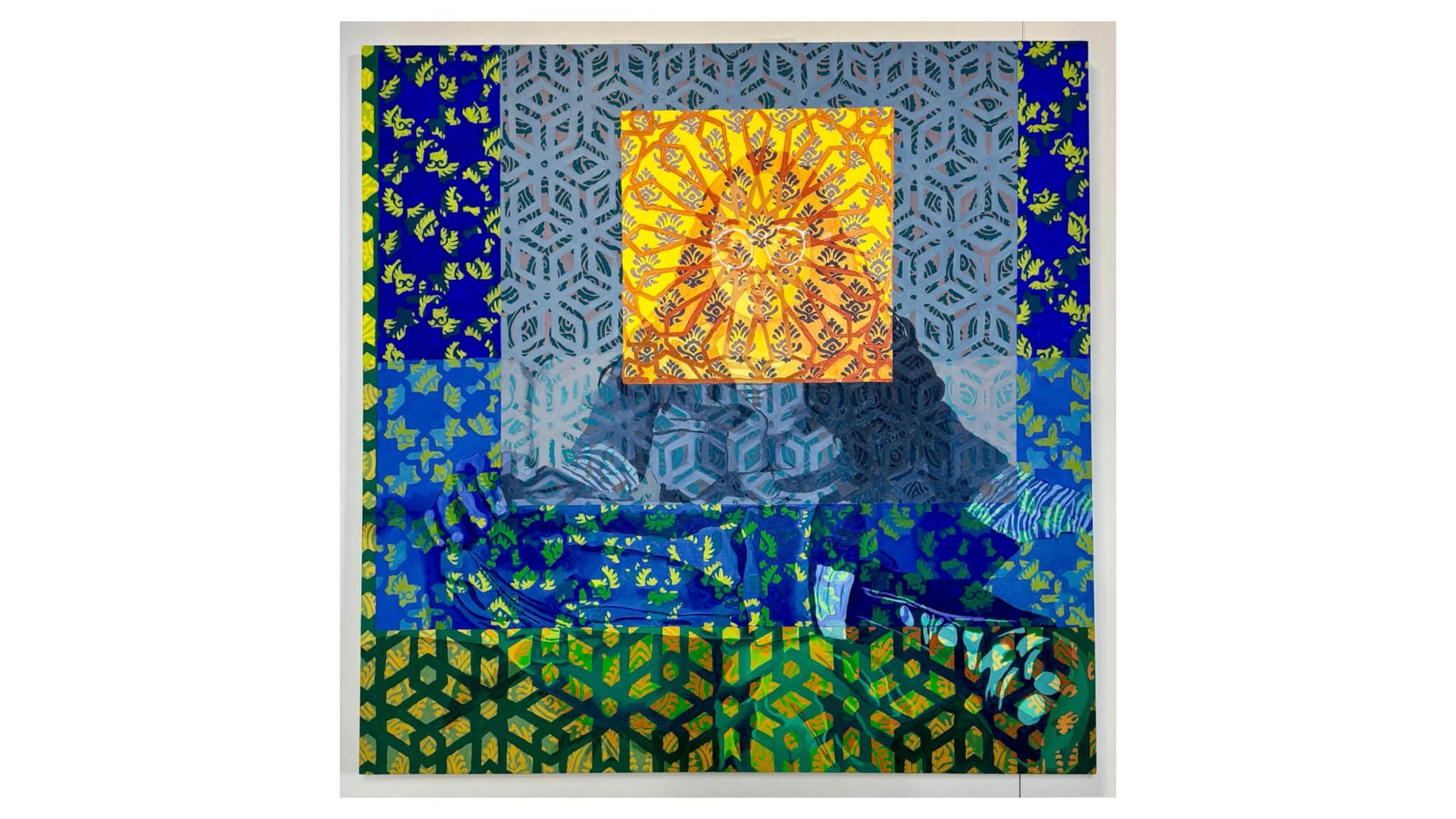 In her oil paintings, Monica Srivastava explores these strategies at both intimate and larger scales by forging a compelling dialogue between portraiture, architecture, and textiles. In Homage to the East (2024), Srivastava—who is second-generation Indian American—riffs on the intricately carved jali screens of sixteenth-to-nineteenth-century Mughal architecture, South Asian block print and textile histories, and Josef Albers’s analyses of line, color, and form. As a painting, it is at once a self-portrait of the artist, a formalist meld of color field and all-over techniques, and an optical experiment. Here repetition, patterning, and color conspire to frustrate one’s ability to discern clearly the woman who gazes back at us.