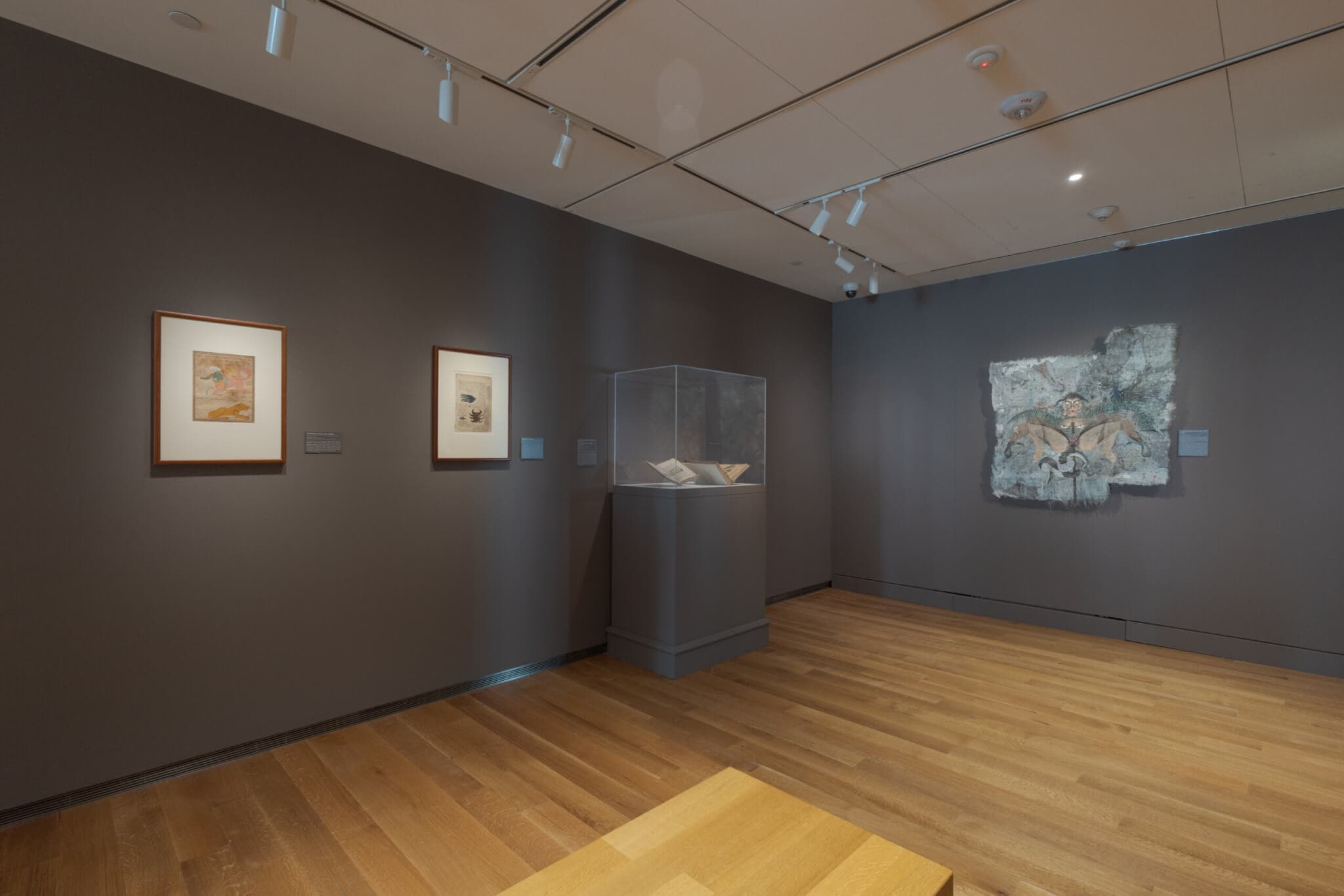 Spread out over two floors of the museum, “Wonders of Creation” initially feels sparse and direct. The exhibition’s opening space is small, with single wall-mounted or glassed-in objects guiding visitors from point to point. Issam Kourbaj’s installation Dark Water, Burning World (2016) is a commentary on the danger-filled flight of Syrian refugees seeking a safer place to live after the country’s 2011 civil war. It also calls back to a similar upheaval in 1220 CE, when a teenaged Zakarīyā ibn Muhammad al-Qazwīnī was among the Iranians who fled to Mosul, Iraq, to escape a Mongol invasion. Al-Qazwīnī would become a respected judge and professor. In the decades after leaving Iran, he wrote one of the most influential books of the era, the cosmography The Wonders of Creation and the Rarities of Existence, from which curator Ladan Akbarnia drew the exhibition’s title and curatorial inspiration.